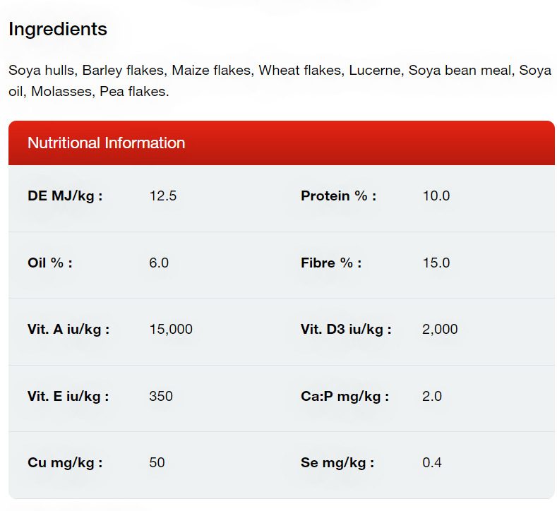Ingredients: Soybean Hulls, Barley Flakes, Maize, Wheat Flakes, Lucerne, Soybean Meal, Soybean Oil, Molasses, Peas