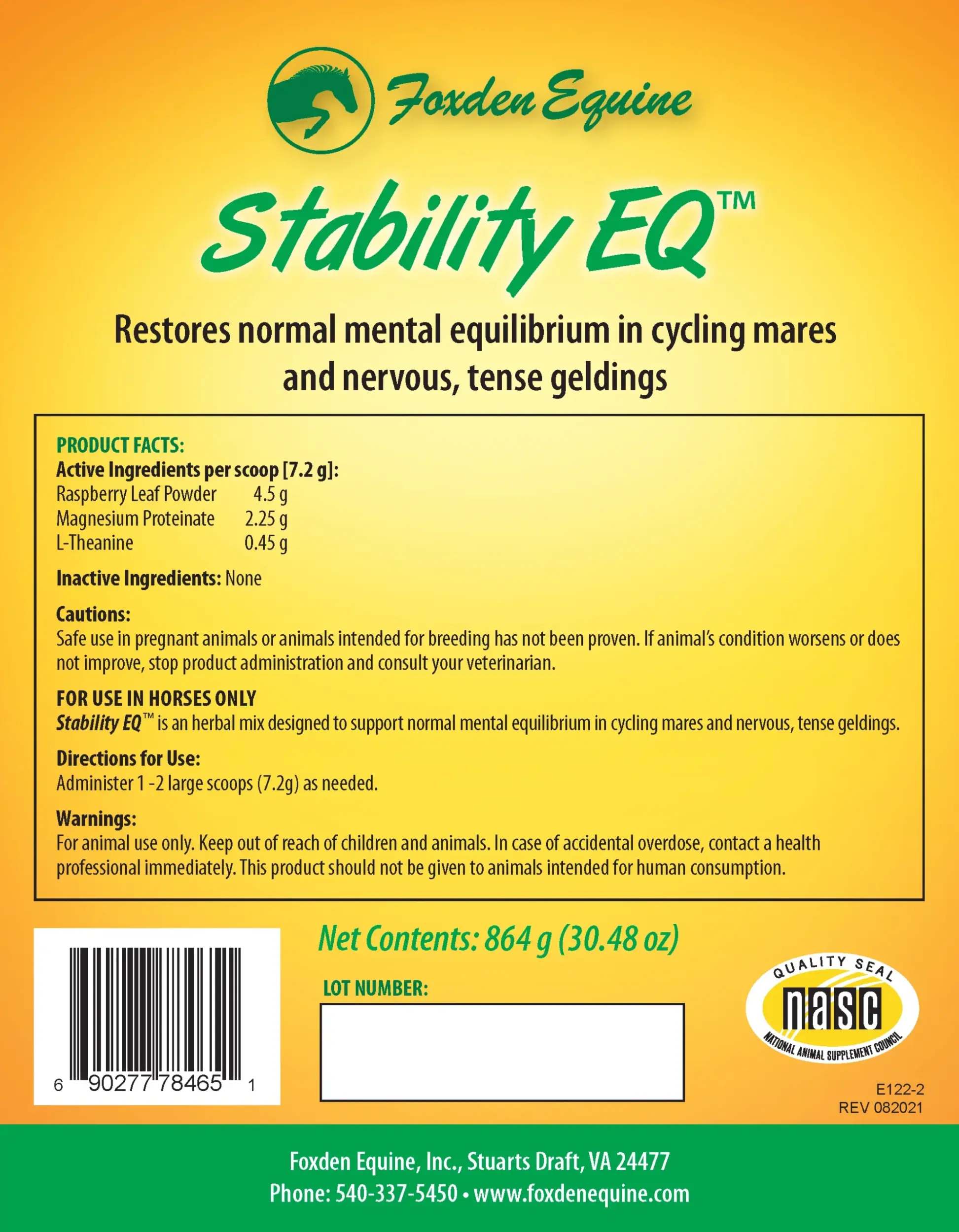 Stability EQ by Foxden Equine is a powdered supplement intended to support normal mental equilibrium in cycling mares and nervous geldings. It contains ingredients such as raspberry leaf, L-theanine and magnesium.