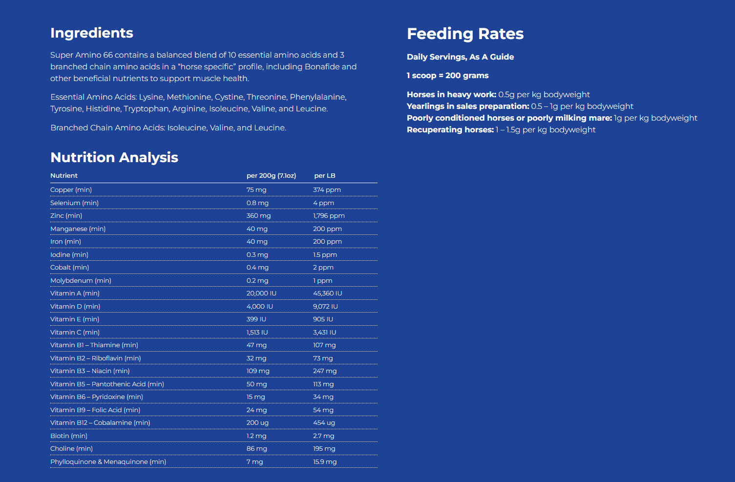 Super Amino 66 from Hygain is a protein supplement containing 10 amino acids. It is intended to support muscle health and also contains vitamins and minerals.