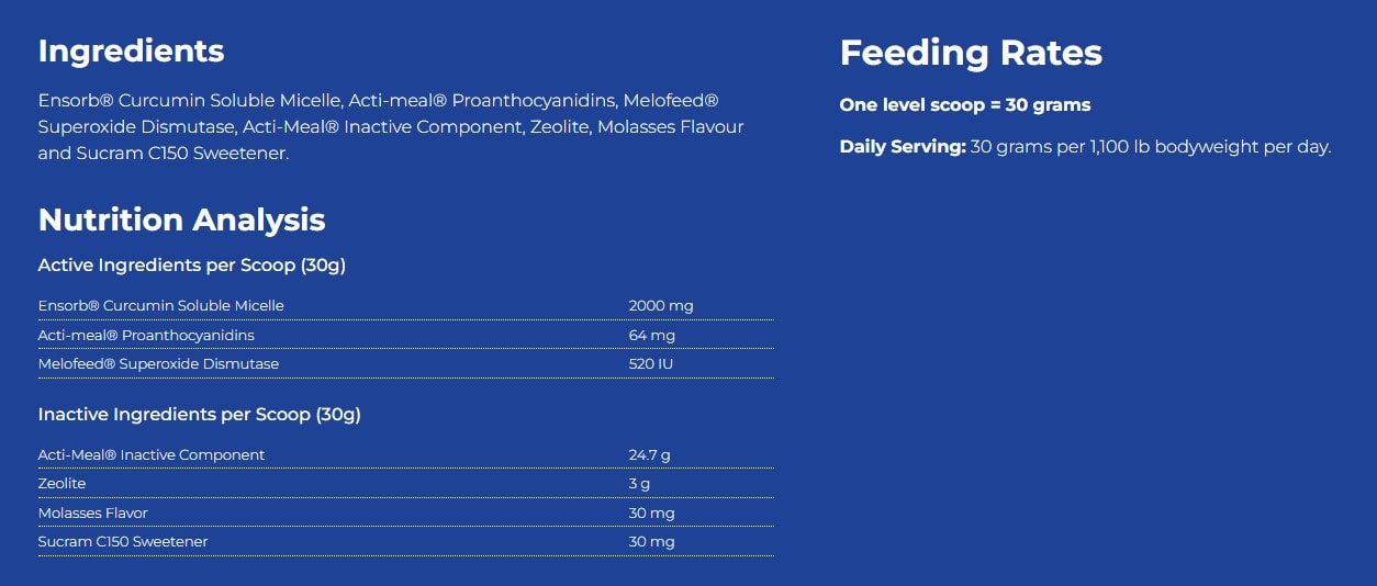 Ingredients: Curcumin Extract, Proanthocyanidins, Superoxide Dismutase, Acti-Meal® Inactive Component, Zeolite, Flavor, Sweetener