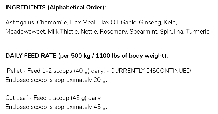 Ingredients: Astragalus (Milkvetch), Chamomile, Ground Flaxseed (Linseed), Flaxseed (Linseed) Oil, Garlic, Ginseng, Dried Kelp, Meadowsweet, Milk Thistle Seeds, Urtica dioica (Common Nettle), Rosmarinus officinalis (Rosemary), Spearmint, Spirulina, Turmeric