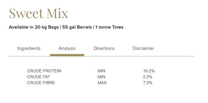 Disclaimer: Listing of a product in the Feed Bank does not imply endorsement or approval by Mad Barn. Products listed are not sold by Mad Barn and should not be construed as product offerings. All trademarks are the property of their respective owners. Although we endeavour to maintain the accuracy of nutritional information in our feed bank, the nutrient analysis may not be complete or accurate based on available information. Users are advised to use this information at their discretion and are encouraged to consult with professional nutritionists or a veterinarian for any specific recommendations or advice.