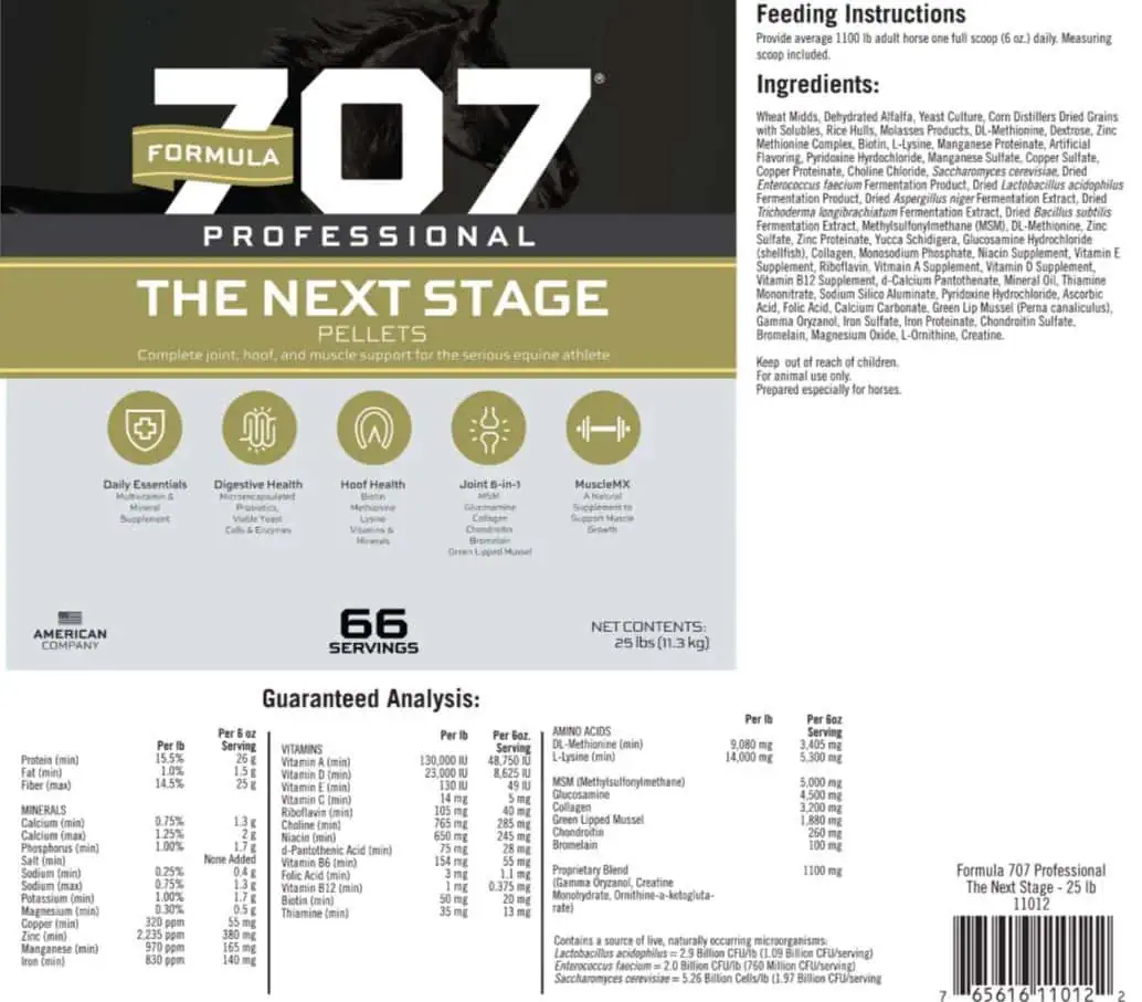Ingredients: Wheat Middlings (Shorts), Alfalfa, Yeast Culture, Corn Distillers Dried Grains With Solubles, Rice Hulls, Molasses, DL-Methionine, Dextrose, Zinc Methionine Complex, Biotin, L-Lysine, Manganese Proteinate, Artificial Flavor, Pyridoxine Hydrochloride (Vitamin B6), Manganese Sulfate, Copper Sulfate, Copper Proteinate, Choline Chloride, Saccharomyces cerevisiae, Dried Enterococcus faecium Fermentation Product, Dried Lactobacillus acidophilus Fermentation product, Dried Aspergillus niger Fermentation Extract, Dried Trichoderma longibrachiatum Fermentation Extract, Dried Bacillus subtilis Fermentation Extract, Methylsulfonylmethane (MSM), Zinc Sulfate, Zinc Proteinate, Yucca schidigera, Glucosamine Hydrochloride, Collagen, Monosodium Phosphate, Niacin (Vitamin B3), Vitamin E Supplement, Riboflavin (Vitamin B2), Vitamin A Supplement, Vitamin D Supplement, Cobalamin (Vitamin B12), Pantothenic Acid (Vitamin B5), Mineral Oil, Thiamine Mononitrate (Vitamin B1), Sodium Silico Aluminate, Ascorbic Acid (Vitamin C Supplement), Folic Acid (Vitamin B9), Calcium Carbonate, Perna canaliculus (Green Lipped Mussel), Gamma Oryzanol, Ferrous Sulfate, Iron Proteinate, Chondroitin Sulfate, Bromelain, Magnesium Oxide, L-Ornithine, Creatine