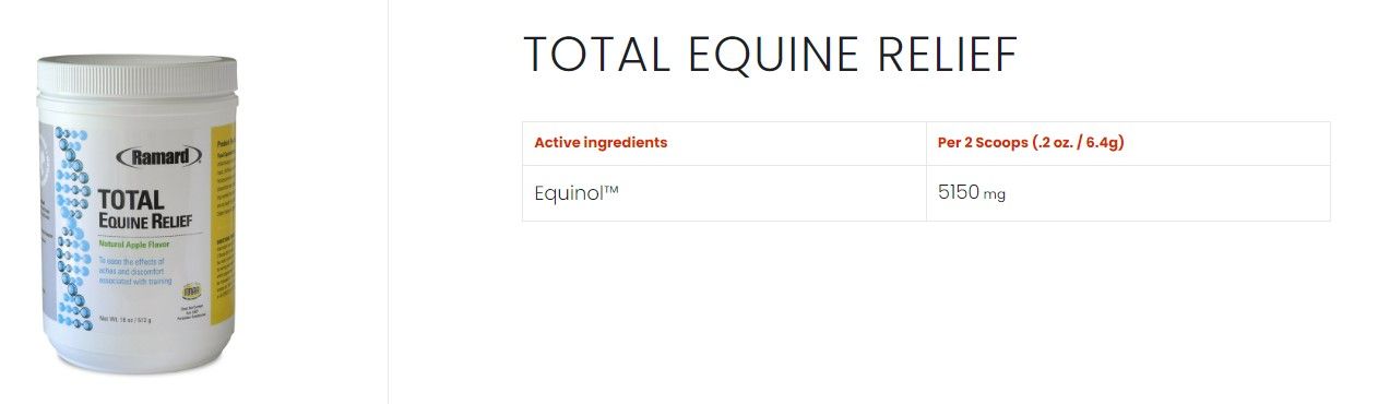 Total Equine Relief from Ramard is a supplement that is meant to help horses recover after exercise, training, or competition. It aims to assist in normal inflammatory responses, to alleviate swelling, aches and stiffness.