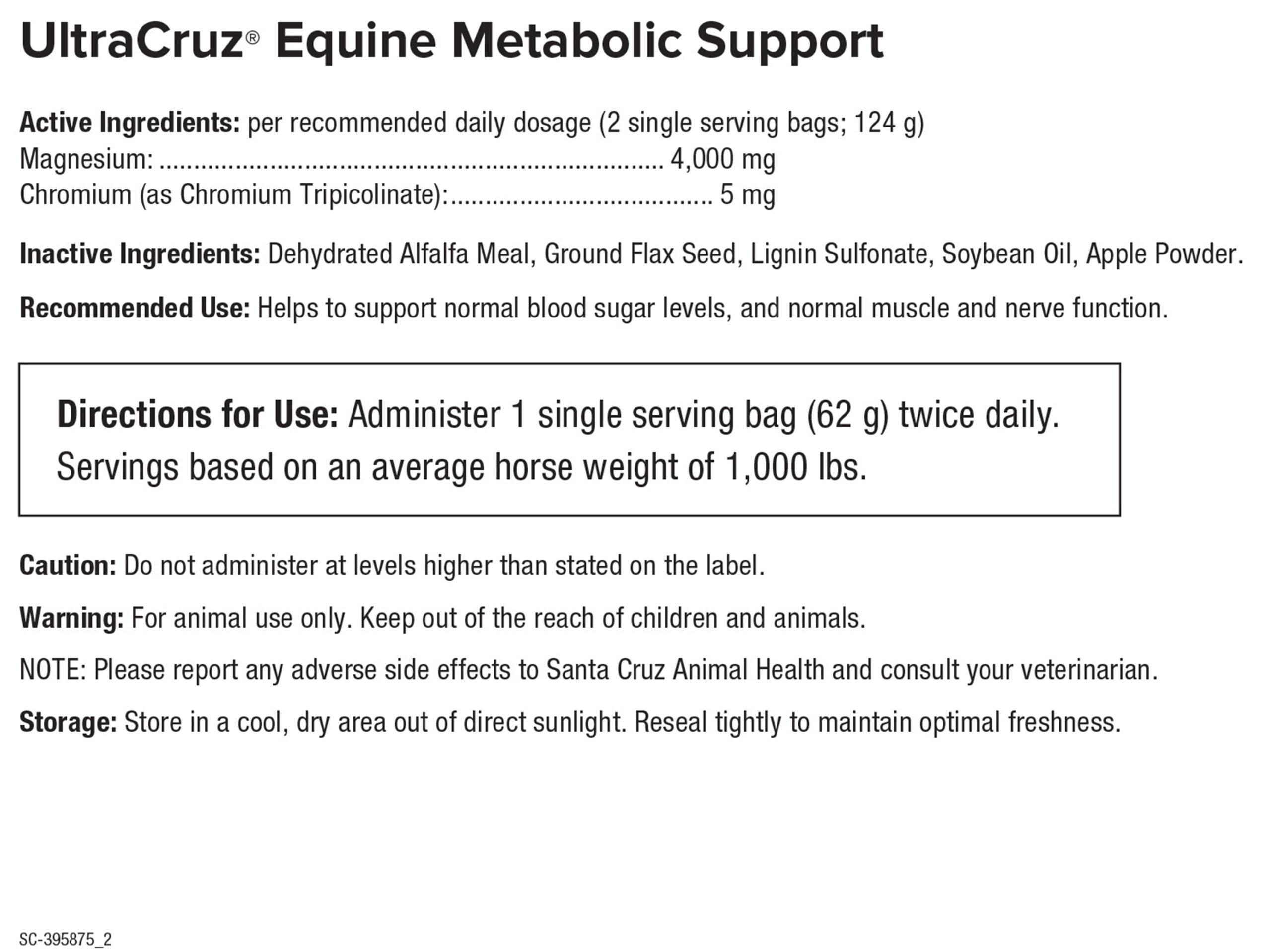 UltraCruz Equine Metabolic Support Supplement is intended to help horses maintain healthy blood glucose levels. It provides 4g of magnesium and 5 mg of chromium per serving (124 g). It is a pelleted formula containing alfalfa meal and flax seed.