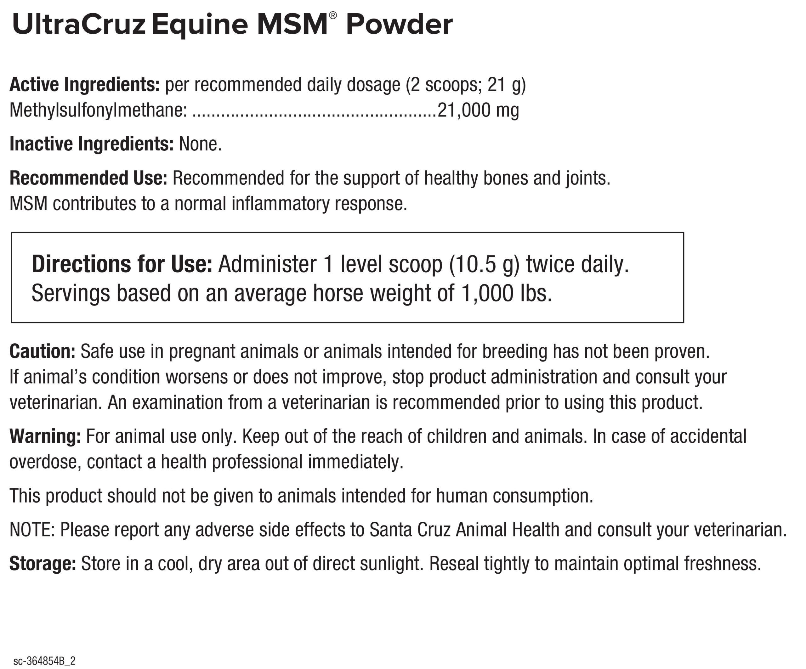 UltraCruz Equine MSM powder is a joint health supplement for horses. It supplies 21 grams of MSM per serving. MSM is a source of organic sulfur, which plays an important role in connective tissue.