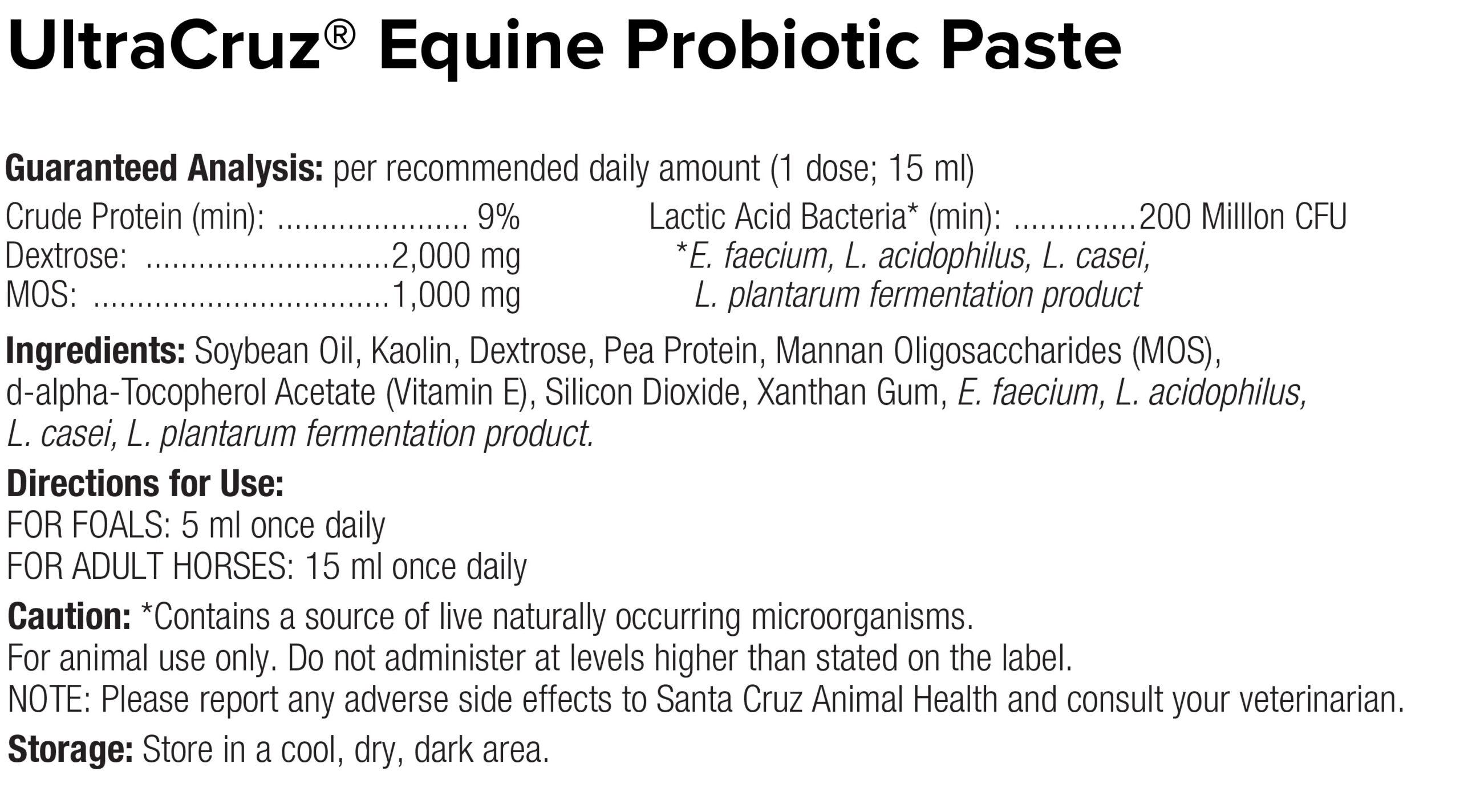UltraCruz Equine Probiotic Paste Supplement provides 200 million CFU (per 15 mL serving) of probiotics and prebiotics meant to support healthy digestive function. It is intended for horses or foals experiencing stress from dietary changes, antibiotics, and/or exercise.