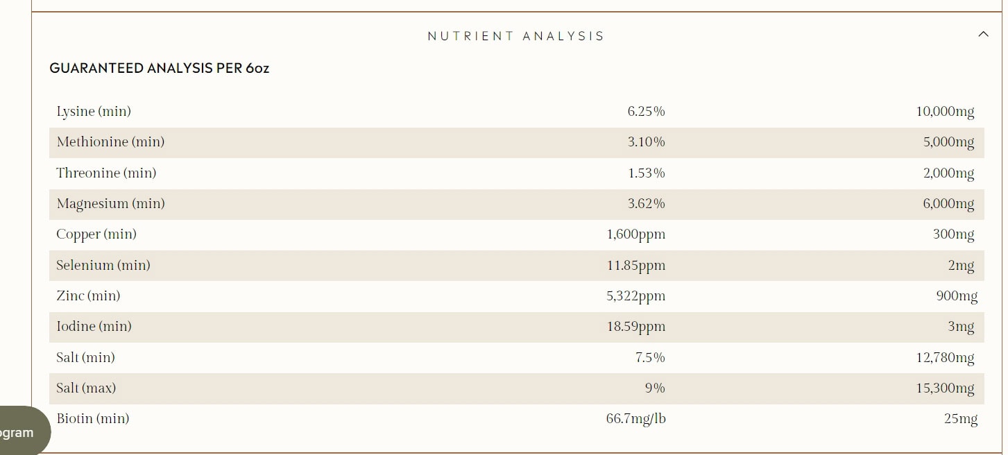 Ingredients: Yeast Culture, Wheat Middlings (Shorts), Salt (Sodium Chloride), L-Lysine, Magnesium Oxide, Zinc Amino Acid Complex, DL-Methionine, Copper Amino Acid Complex, Selenium Yeast, L-Threonine, Biotin, Natural and Artificial Flavors, Ethylenediamine Dihydroiodide (EDDI)