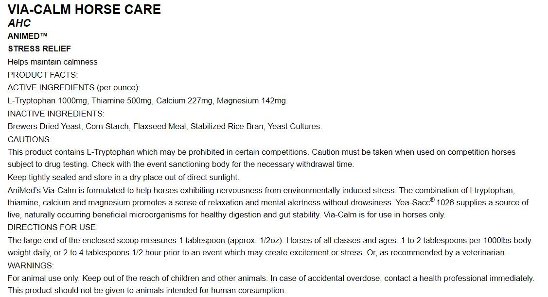 AniMed's Vita-Calm is a supplement that is meant to reduce stress and provides vitamins, minerals, and amino acids. It can help calm horses, especially before events which may cause nervousness.