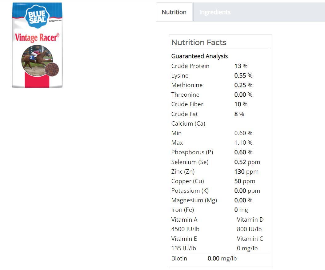 Vintage Racer by Blue Seal is a now-discontinued high-fat extruded feed formulated for performance horses. It contains 13% crude protein and 8% fat, with energy sources including beet pulp, cracked corn, soybeans, rice bran and oil. It is also suitable for horses with respiratory issues due to its low dust content.