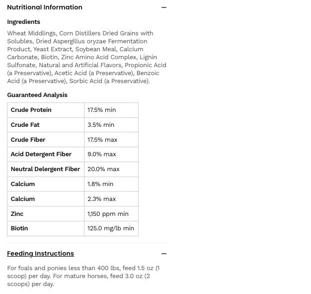 | SulfurSulfur is a component of the amino acids methionine and cysteine. It is important for hoof health, joint function, coat quality and metabolic health. | -- | % DM | -- | g | ||