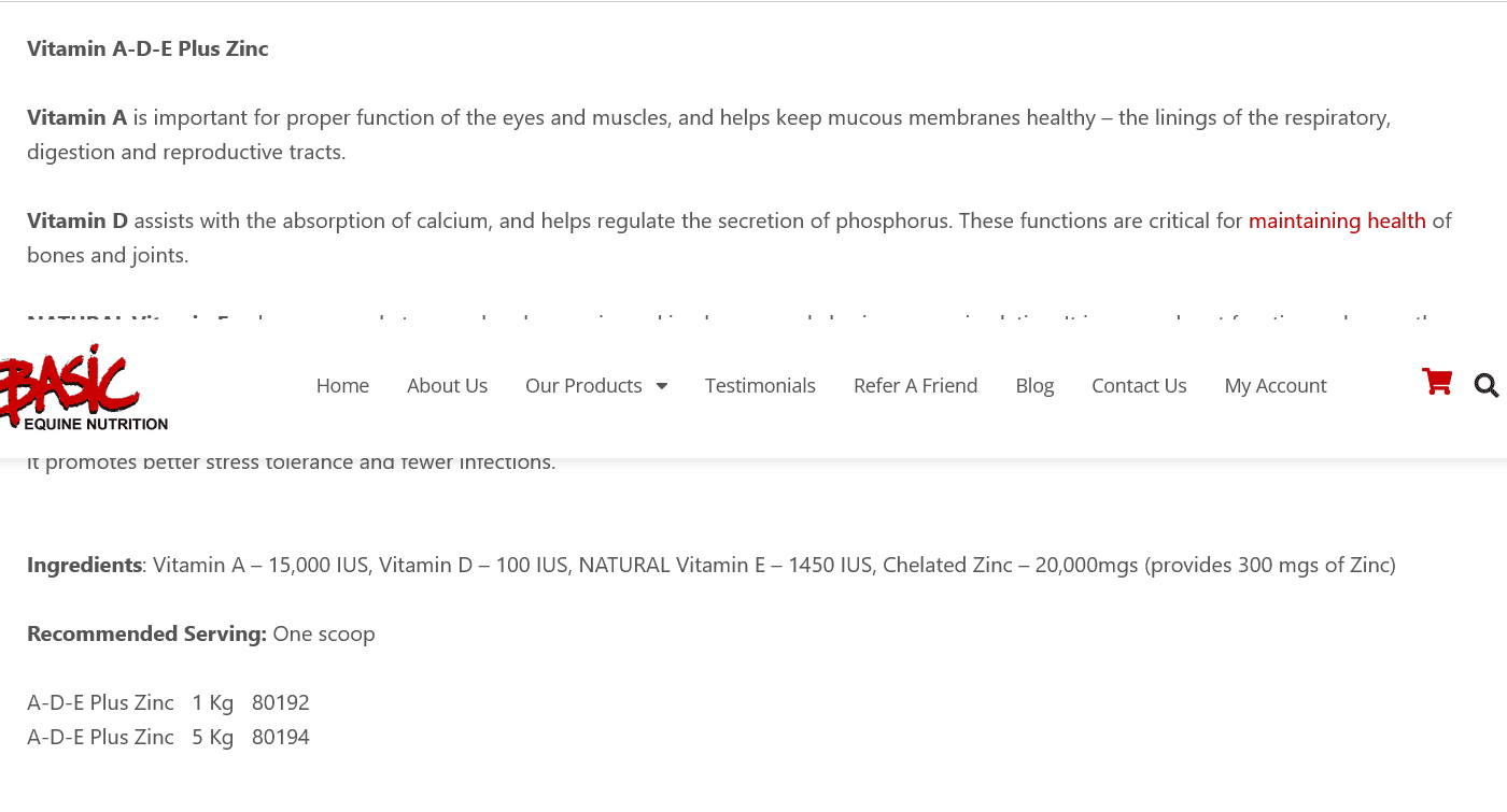 Vitamin A-D-E Plus Zinc is an equine supplement that provides a blend of the fat-soluble vitamins A, D and E. These vitamins are important for muscle, bone and joint health. This supplement also contains organic zinc to support the immune system.