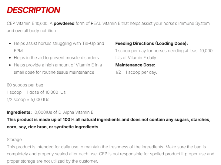 Vitamin E 10,000 from CEP is a powdered form of vitamin E that is intended to help with immunity and muscle health. Each scoop contains 10,000 IUs of vitamin E.