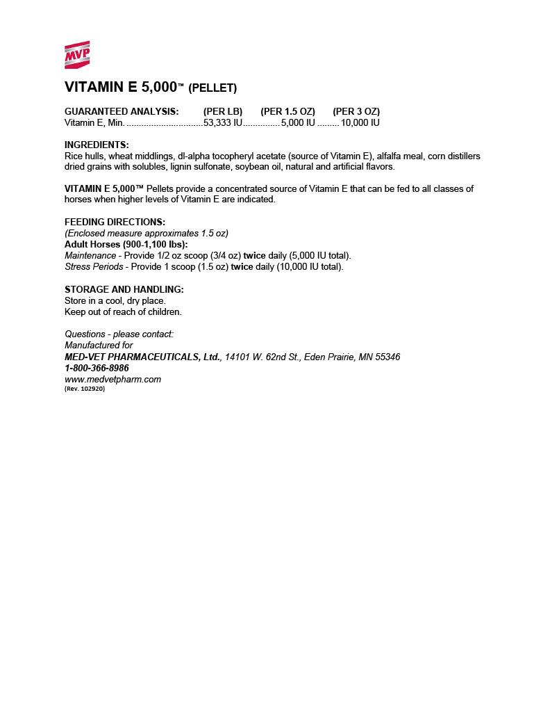 Vitamin E 5,000 by MVP is a pelleted supplement that intends to provide a concentrated source of Vitamin E that can be fed to all classes of horses when higher levels of Vitamin E are needed.