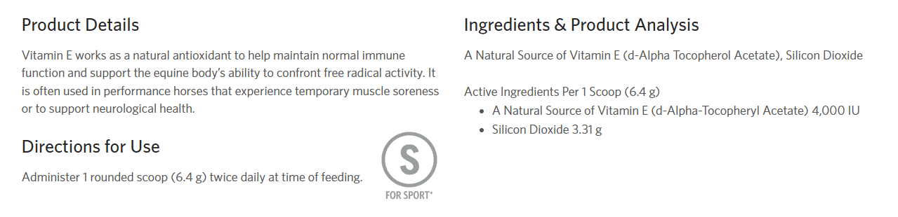 Platinum Performance Vitamin E is an antioxidant supplement for horses containing 4,000 IU of d-Alpha-Tocopheryl Acetate (natural Vitamin E) per serving.