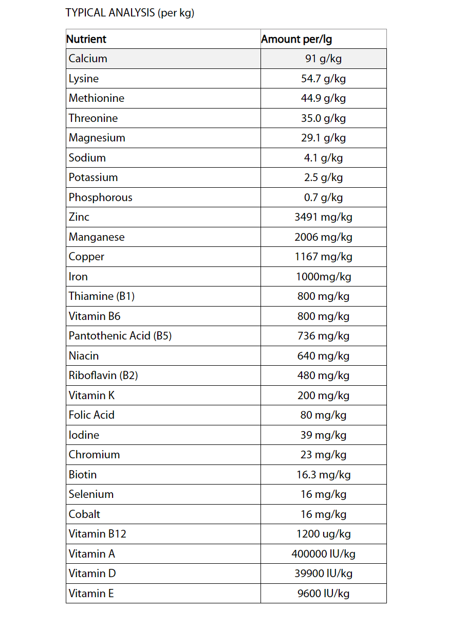 | ZincZinc support many metabolic processes and is involved in coat and hoof quality, immune function and metabolic health. It should be fed in balance with iron and copper. | 3526.3 | ppm | 3491 | mg | ||