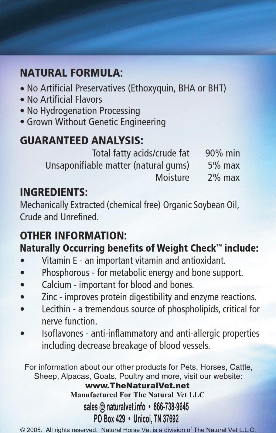 Weight Check Oil by Natural Horse Vet is a liquid supplement that provides the essential fatty acids of omega 3 and 6 through soybean oil. It also contains vitamin E, phosphorus, and calcium.