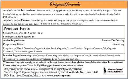 Yucc' It Up! Original Formula from Yucc' It Up! is intended to provide whole-body support for horses. Yucc' It Up! Original Formula contains yucca schidegera herb which is intended to support intestinal health.