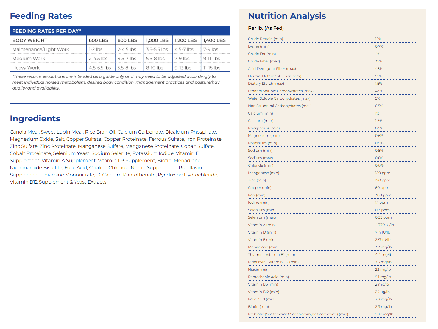 | LysineLysine is typically considered the first limiting amino acid in equine diets. It is involved in immune function, metabolism, and making collagen and elastin. | 4.7 | % CP | 12.7 | g | ||