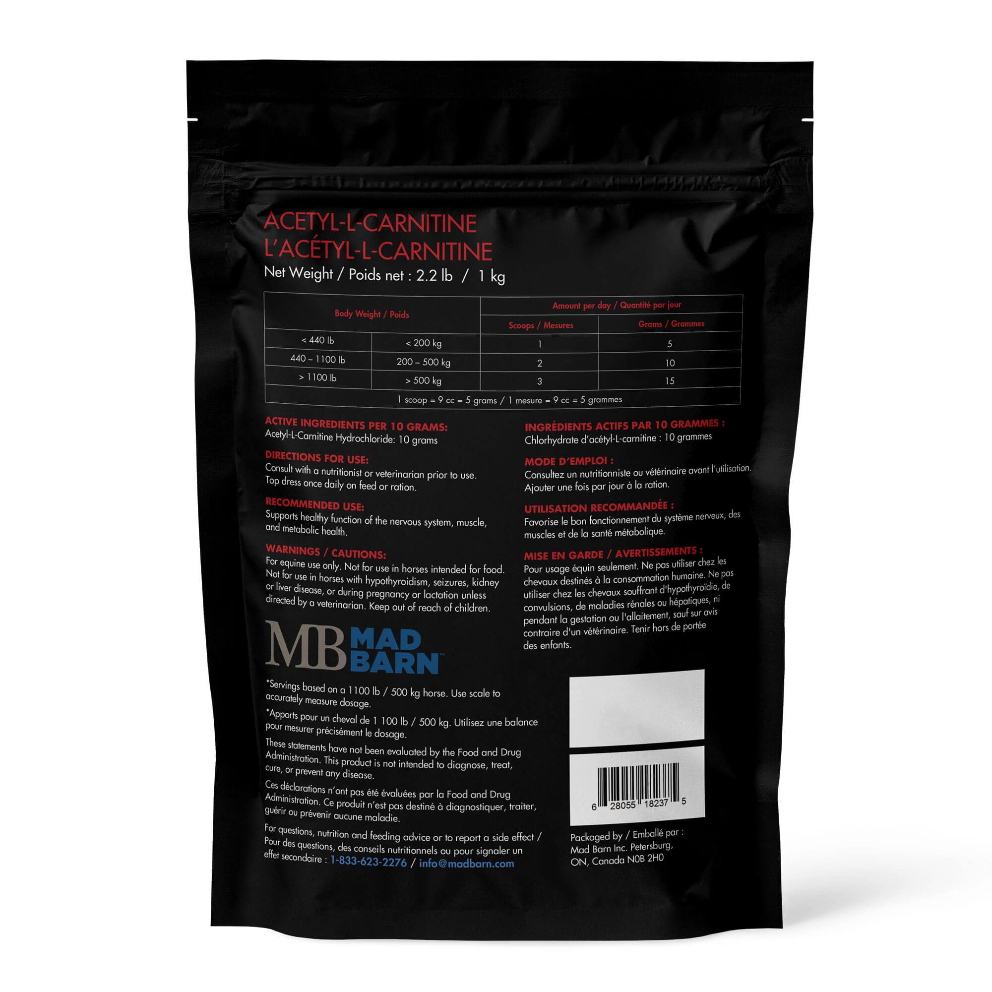 Acetyl-L-carnitine is a white powder with a vinegar-like odor that is generally well accepted by horses. The typical feeding rate for a 500 kg (1100 lb) horse is 10 grams per day and this can be top-dressed on their daily ration.