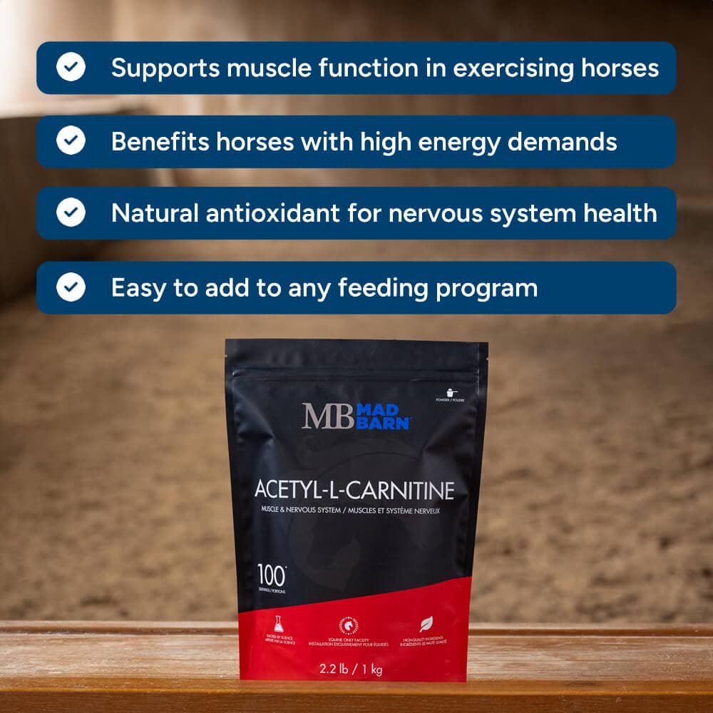 “Acetyl-L-carnitine is of benefit when horses are experiencing sore muscles, hard muscles, failure to build muscle as expected and failure to meet training milestones when there is no obvious skeletal cause. L-carnitine supplementation is proven to enhance metabolic adaptation to exercise in horses.”