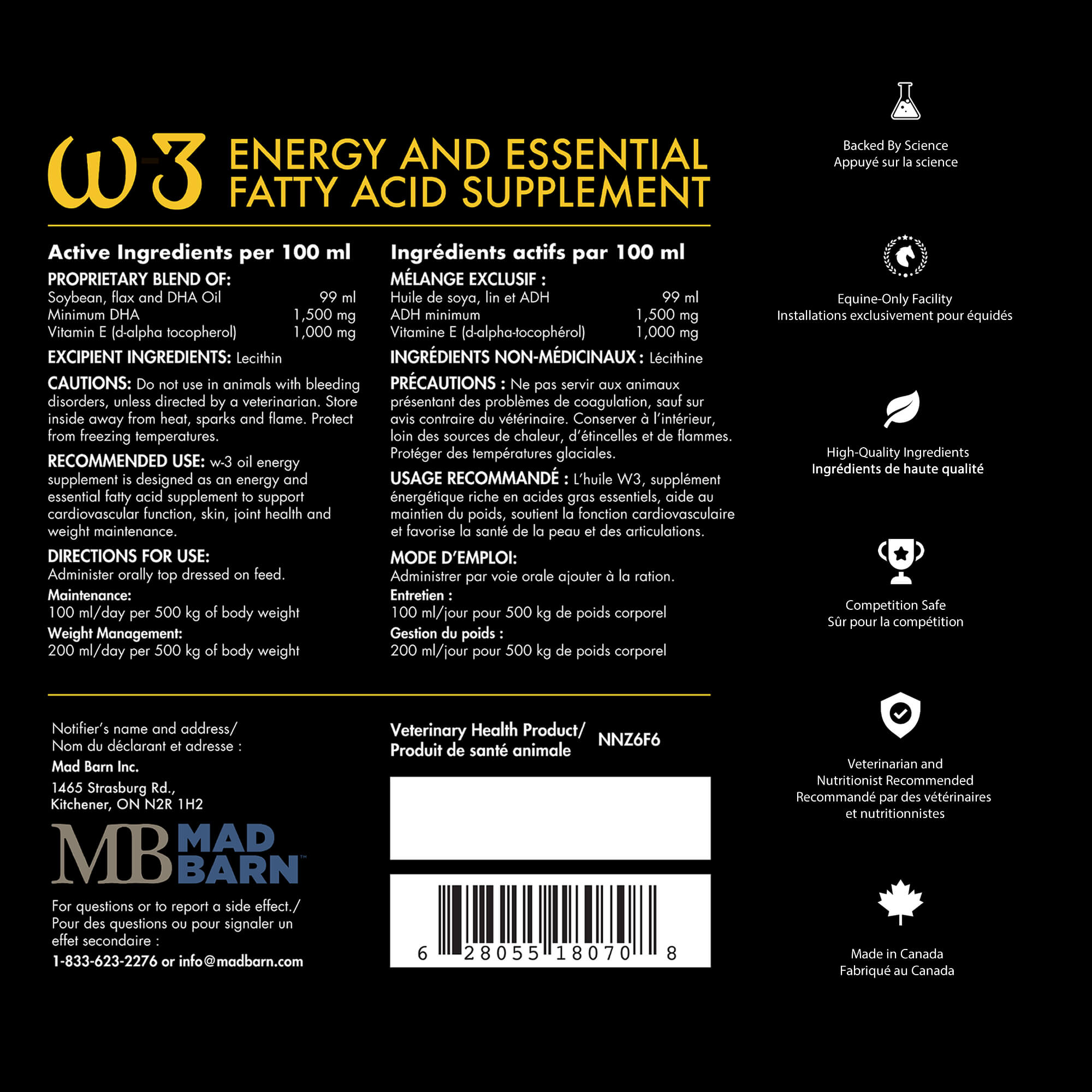 Mad Barn’s w-3 Oil is the ultimate essential fatty acid and energy supplement for your horse. Carefully formulated with proven ingredients, this product supports cardiovascular function, immune health, skin and joint health, weight maintenance and more.